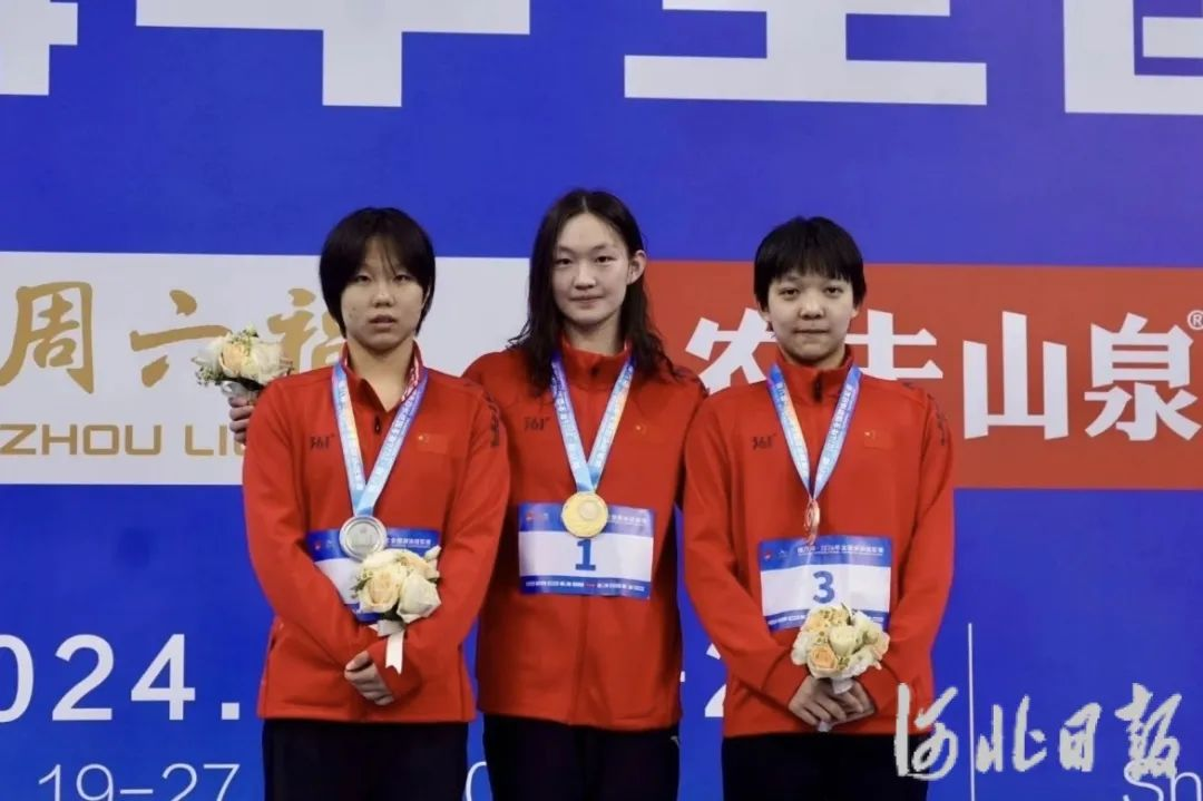 图为李冰洁(中)、高唯中(左)、马永慧(右)在领奖台上。河北泰华锦业游泳俱乐部供图