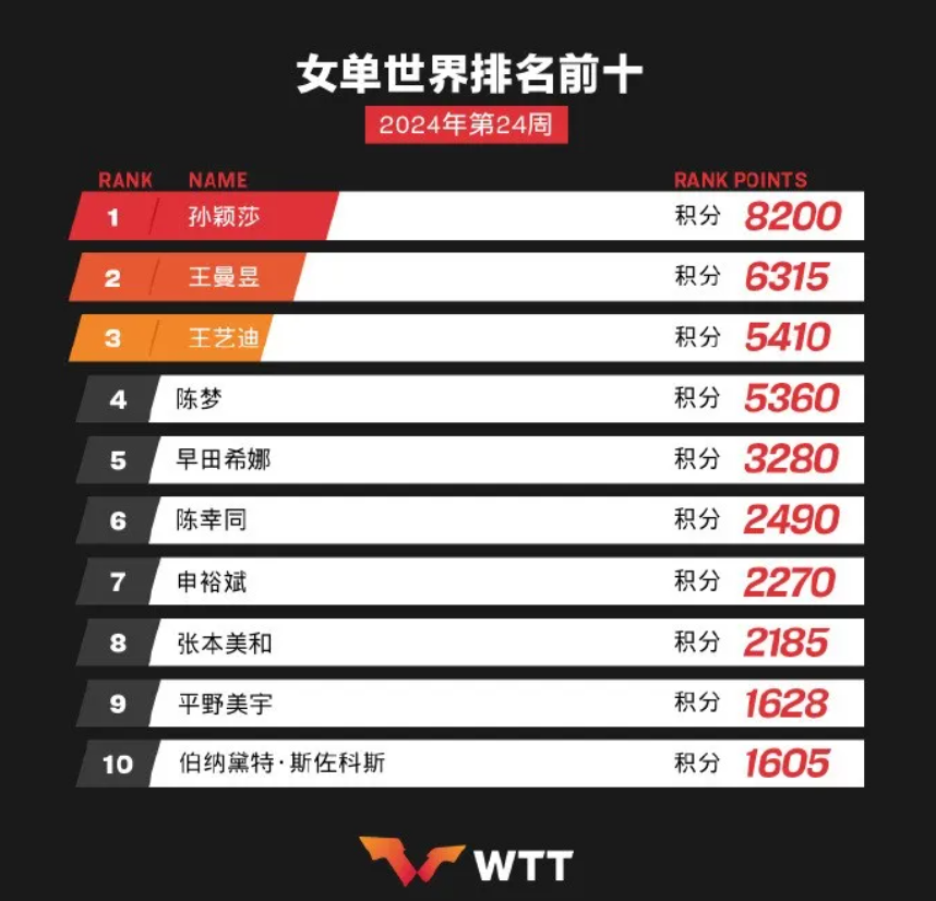 女单排名中,王曼昱、王艺迪、陈梦位列前2至4位,陈幸同位列第6。 平野美宇排名上升2个名次位列第9。其他中国队球员,钱天一排名第16,蒯曼排名第25,何卓佳排名第40,石洵瑶排名第42,李雅可排名第45。