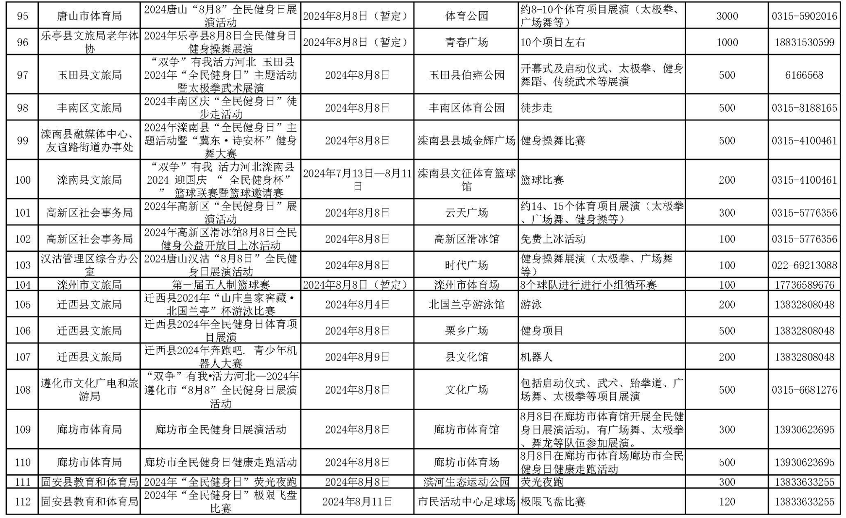 快来看!“全民健身日”期间全省各地将举办哪些主题活动? 来源:冀体融媒 时间:2024-08-06 今年8月8日是第16个“全民健身日”“全民健身日”期间全省各地举办形式多样的主题活动让我们一起来欣赏各地赛事活动的风采吧!2024年河北省“全民健身日”主题活动安排 责任编辑:体球网(spbo)足球即时比分查询