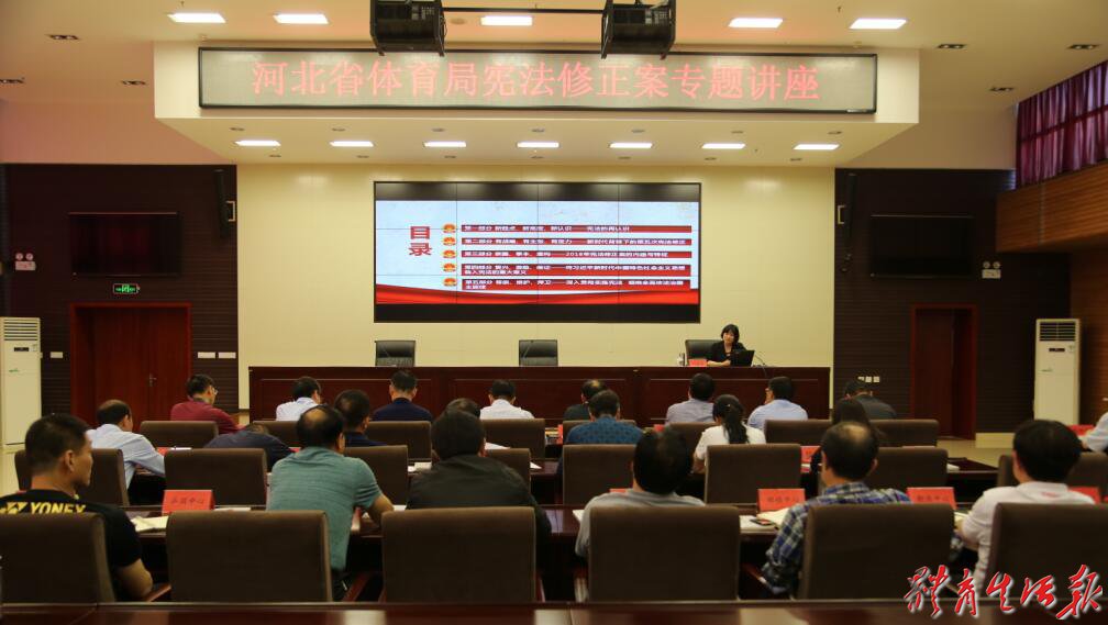 为大力弘扬宪法精神,深刻把握宪法修正案核心内涵,进一步增强省体育局系统干部队伍的宪法意识,不断提升履行宪法使命的能力和水平,根据省委安排,省体育局于5月4日举办了宪法修正案专题讲座,邀请河北行政学院教研部副主任、河北省政府参事室特约研究员、河北省“七五”普法讲师团专家库首席专家闫丽丹解读宪法修正案。省体育局党组书记、局长何江海作重要讲话,省体育局党组副书记、副局长李东奇主持。