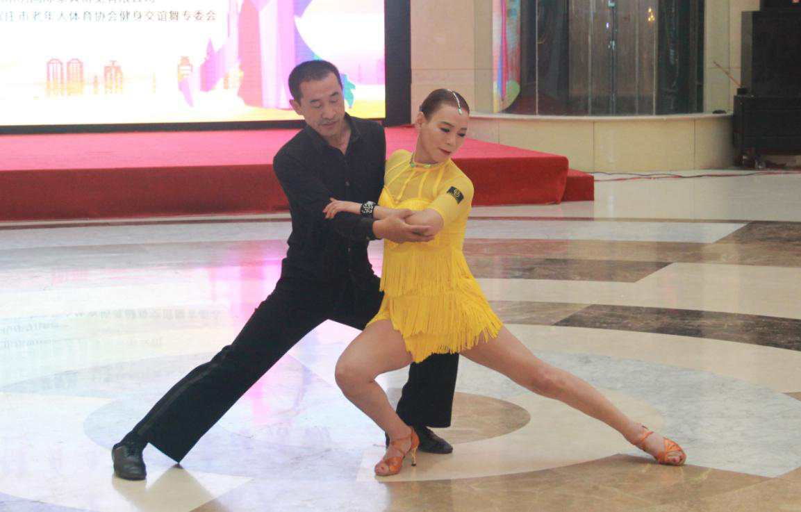 来自石家庄市老年体协的50余位老年人进行了伦巴集体舞、双人交谊舞、集体莎莎舞、华尔兹、健身交谊舞等表演,老年舞者们舞姿绰约,精神抖擞,以饱满的状态充分展示了老年人积极参与全民健身的热情和良好的精神风貌。