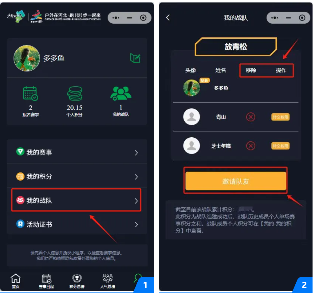 队长权限:战队组建成功后,在参与后续赛事活动时,队长可根据报名情况指定1名成员进行权限移交,战队其他成员也可进行更换。