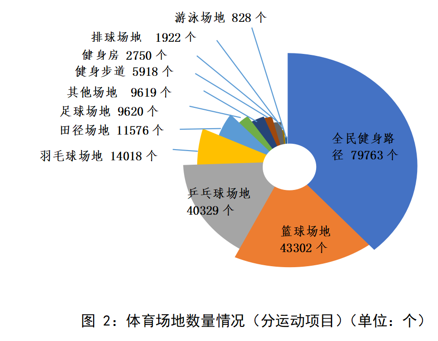全省全民健身路径79763个。全省健身房2750个。全省健身步道5918个,长度19941.2公里。