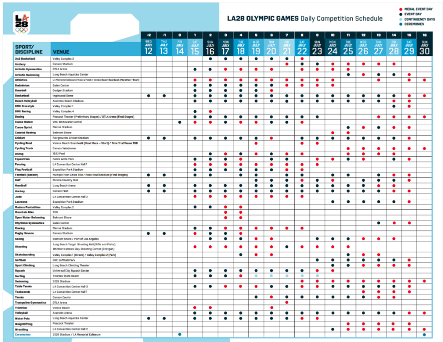 在洛杉矶奥运会倒计时三周年之际,洛杉矶奥组委于当地时间14日公布了第一版竞赛日程。本届奥运会将于2028年7月14日开幕,7月30日闭幕。