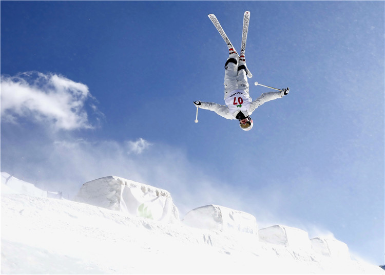这是运动员在张家口市崇礼区太舞滑雪场参加自由式滑雪雪上技巧比赛(2018年12月16日摄)。