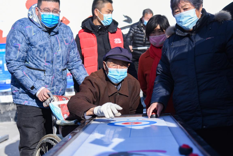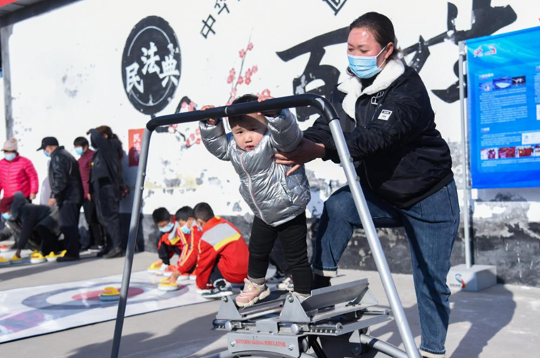 活动现场布置了陆地冰壶、桌面冰壶、滑雪模拟机等冰雪运动体验区,配备了专业的工作人员和志愿者为村民详细介绍冰雪体验项目的使用规则和注意事项。随着节目的鼓声越敲越响,越来越多的村民被吸引过来。老人带着小孩,大爷拽着大妈,现场一下子热闹起来,各种冰雪体验项目前面聚满了前来体验的村民。