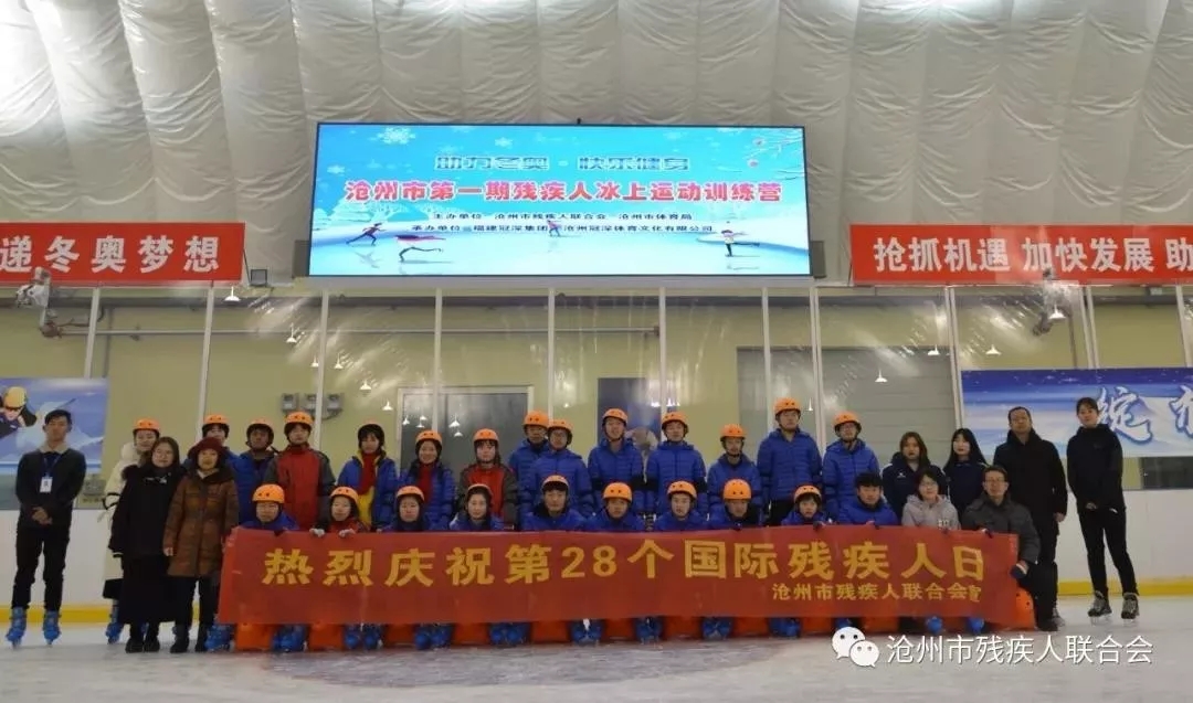 在第28个国际残疾人日来临之际,沧州市残联、体育局联合主办的第一期残疾人冰上运动训练营在气膜滑冰馆正式开营,来自沧州市特教学校的师生、市残联和市体育局的工作人员以及滑冰馆志愿者共计60余人参加了此次活动。