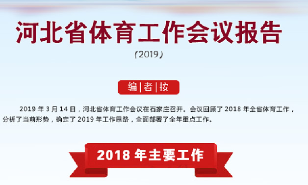 3月14日,2019年全省体育工作会议在石家庄召开。会议深入学习贯彻习近平新时代中国特色社会主义思想和习近平总书记关于体育工作的重要论述精神,全面贯彻全国体育局长会议和省委九届八次全会、省"两会"精神,回顾总结2018年全省体育工作,分析了当前面临形势,确定2019年工作思路,全面部署2019年重点工作。省体育局党组书记、局长张泽峰出席会议并讲话,党组副书记、副局长李东奇主持会议,副局长唐青、何文革、田建功,副巡视员陈飞、王春出席会议。张泽峰指出,2018年全省体育系统坚定不移推进改革创新,在各领域取得了突出成绩。一是大力实施《河北省全民健身实施计划》,初步形成覆盖省市县乡的全民健身公共服务体系...