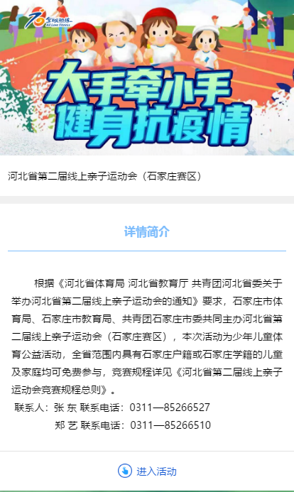 “河北省第二届线上亲子运动会(石家庄赛区)报名开始啦! 来源:新媒体中心 时间:2021-02-24 关注石家庄市体育局官方微信公众平台“热练国际庄”,点击“赛事活动”栏目,进入“全城热练赛事平台”,选择“河北省第二届线上亲子运动会(石家庄赛区)”进行报名和参加活动。 责任编辑:体球网(spbo)足球即时比分查询