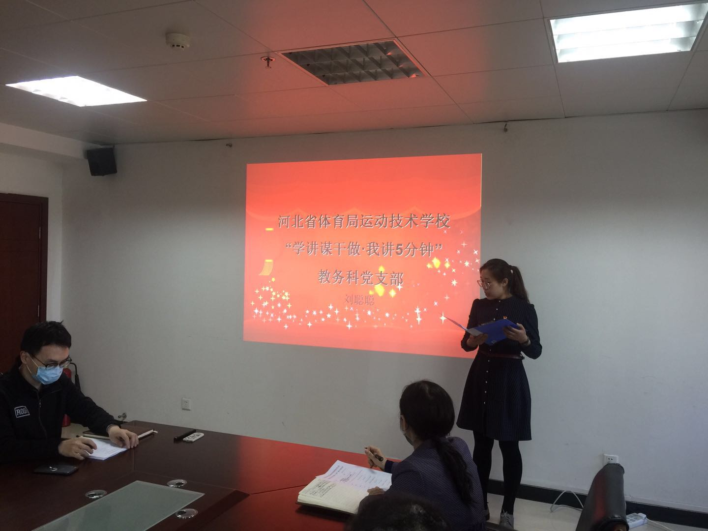 为进一步落实学校“学讲谋干做”方案要求,做到活动规定动作不放松、自选动作有特色,进一步提升全校职工素质能力。4月23日上午,运动技术学校教务科党支部组织开展了“我讲五分钟”展示交流活动。校领导高辉、“学讲谋干做”工作专班全体成员出席了活动,活动由教务科科长李红主持。