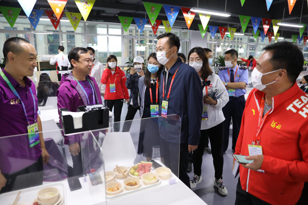 慰问结束后,张泽峰一行来到全运会运动员村委会,在村委会执行副村长杨祎的陪同下,先后参观了村委会、西安国际港务区展厅、运动员村文创中心、运动员村医疗中心、运动员餐厅,详细了解了运动员村疫情防控、反兴奋剂、训练保障、安全保卫、医疗卫生、食宿交通等情况。张泽峰表示,河北代表团来到西安后,充分感受到陕西省委省政府对全运会承办的高度重视,西安市民的热情好客和十四运会组委会工作人员的无私奉献,尤其是运动员村在做好疫情防控的同时,为各代表团运动员提供了优质服务保障。他代表河北省代表团向运动员村委会全体工作人员表示衷心感谢。