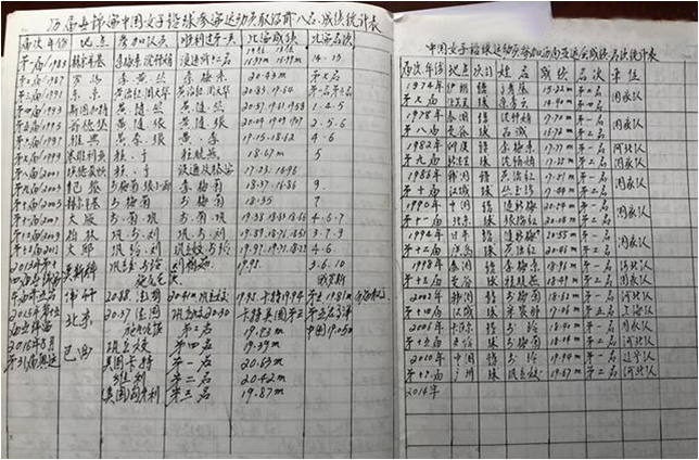 何增生笔记本中记录着女子铅球各类大赛成绩